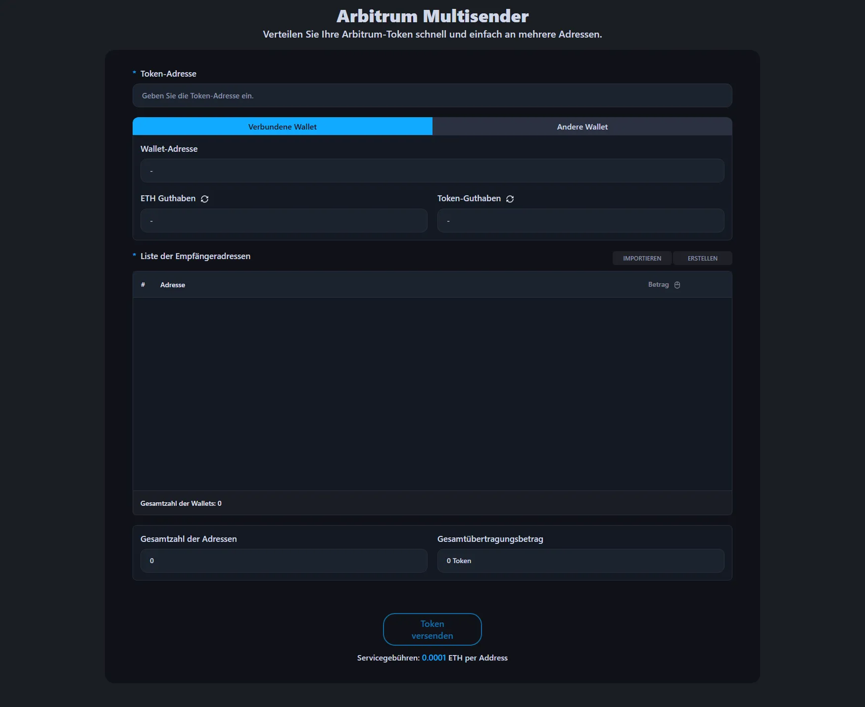 Die Servicegebühr beträgt 0,0001 ETH pro Empfängeradresse. Zum Beispiel: Bei 100 Wallets beträgt die Servicegebühr 0,01 ETH, zuzüglich der Standard-Arbitrum-Gasgebühr.