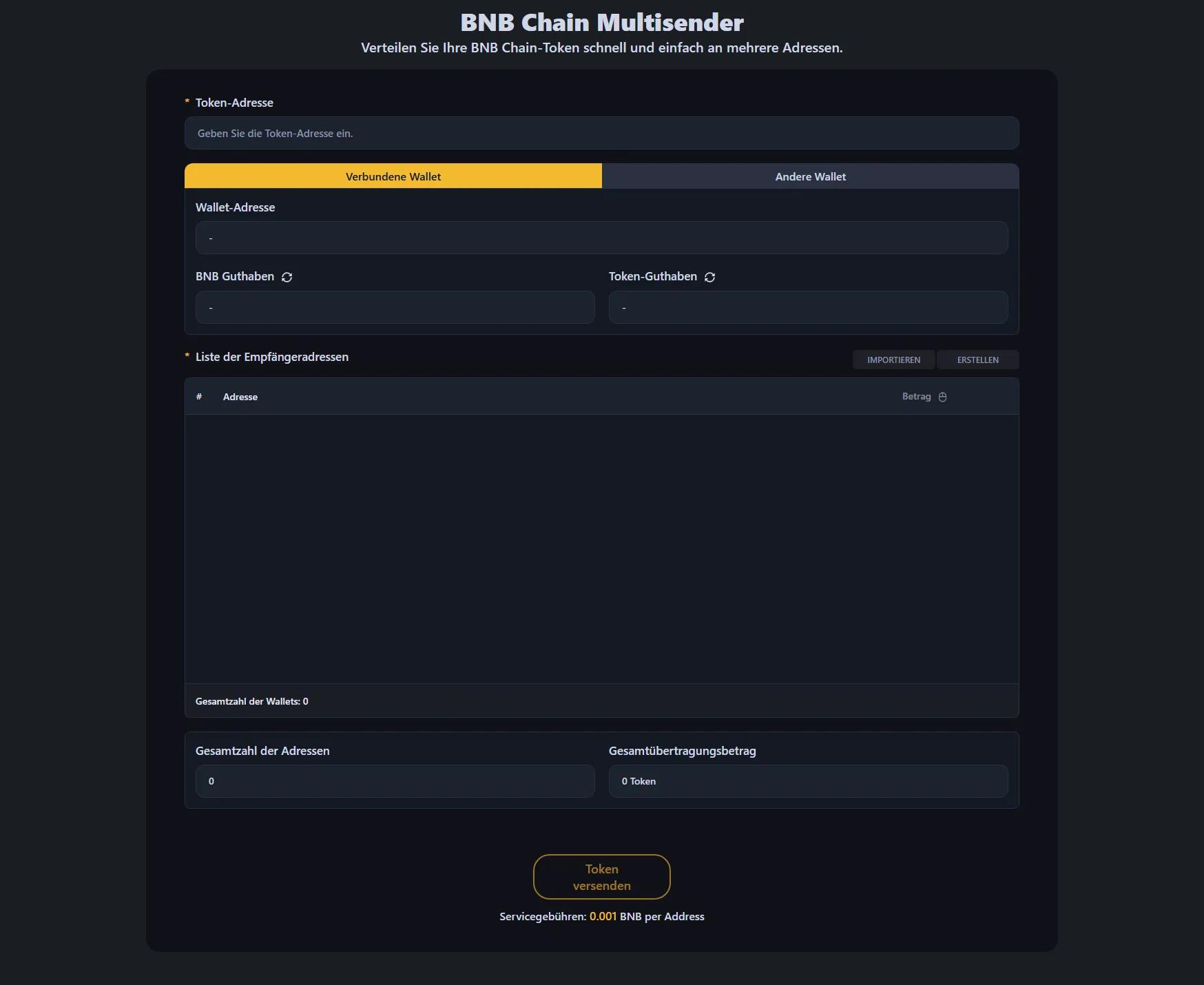 Die Servicegebühr beträgt 0,0001 BNB pro Empfängeradresse. Zum Beispiel: Bei 100 Wallets beträgt die Servicegebühr 0,01 ETH, zuzüglich der Standard-BNB Chain-Gasgebühr.