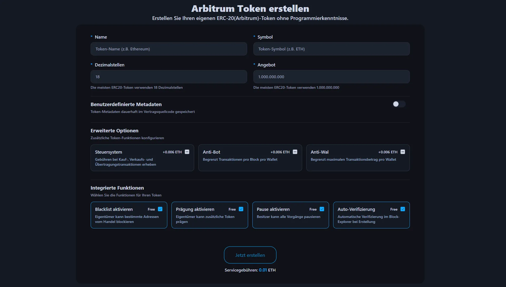 Die Verwendung der Arbitrum Token Creator dApp eliminiert den komplexen Programmierungsprozess. Smart Contracts werden automatisch mit nur wenigen Klicks generiert, und professionelles Token-Deployment wird für 0.01 ETH abgeschlossen.