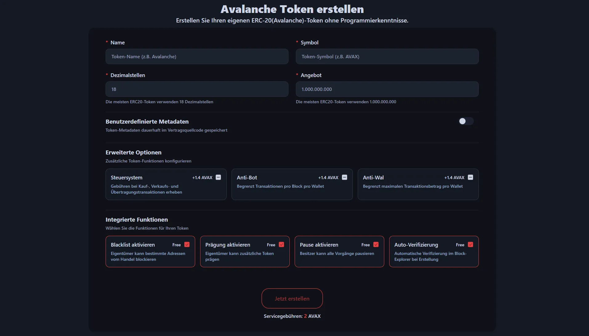 Die Verwendung der Avalanche Token Creator dApp eliminiert den komplexen Programmierungsprozess. Smart Contracts werden automatisch mit nur wenigen Klicks generiert, und professionelles Token-Deployment wird für 2 AVAX abgeschlossen.