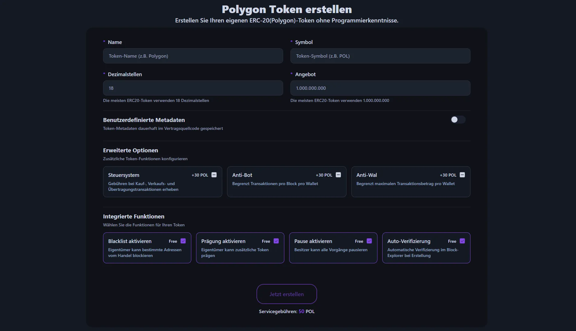 Lassen Sie uns erkunden, wie man einen leistungsstarken ERC-20 Token auf der Polygon Blockchain ohne Programmierkenntnisse erstellt. Alpheccas Polygon Token Generator bietet eine intuitive Benutzeroberfläche mit verschiedenen anpassbaren Funktionen und ermöglicht professionelles Token-Deployment in unter einer Minute für nur 50 POL.