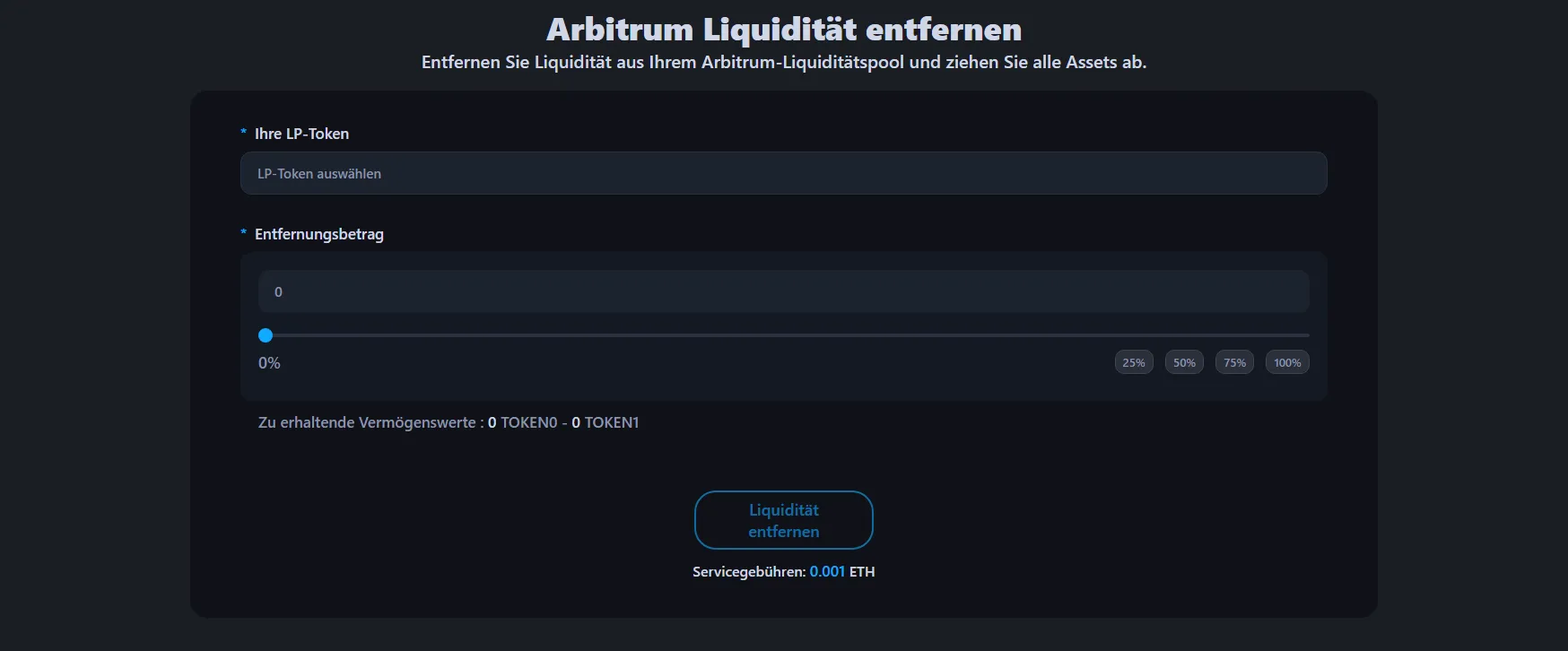 Eine ausführliche Anleitung zum Entfernen von Liquidität aus Arbitrum Pools finden Sie in unserem EVM-Chain Liquiditäts-Entfernungs-Tutorial.
