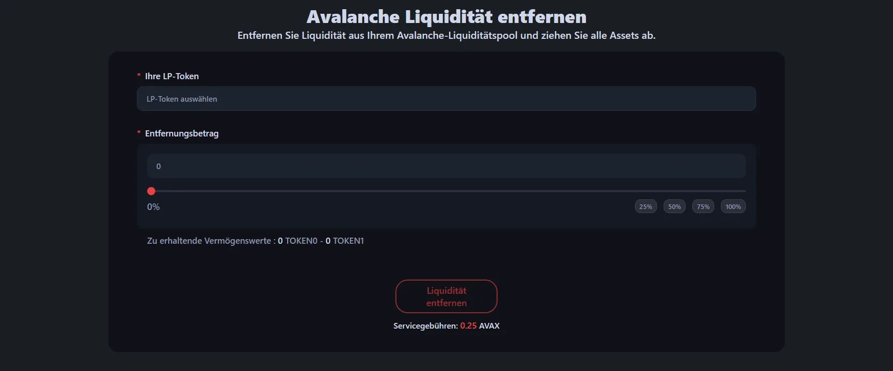Um Liquidität aus Ihrem Avalanche Token-Pool zu entfernen, gehen Sie zum Avalanche Liquiditäts-Entfernungstool und verbinden Sie die Wallet, die Ihre LP-Token oder NFT-Position enthält.