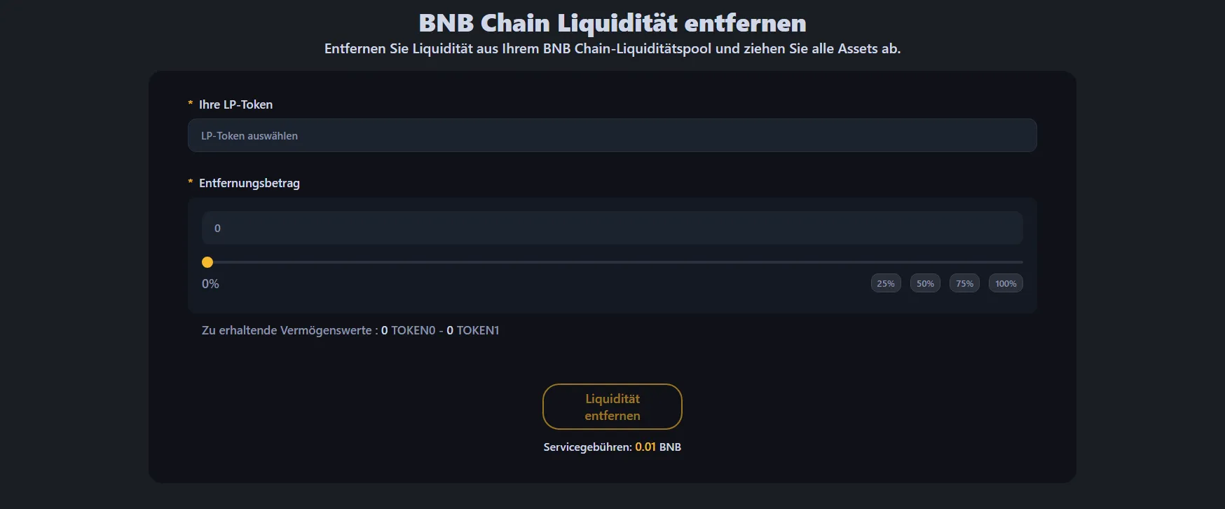 Um Liquidität aus Ihrem BNB Chain Token-Pool zu entfernen, gehen Sie zum BNB Chain Liquiditäts-Entfernungstool und verbinden Sie die Wallet, die Ihre LP-Token oder NFT-Position enthält.