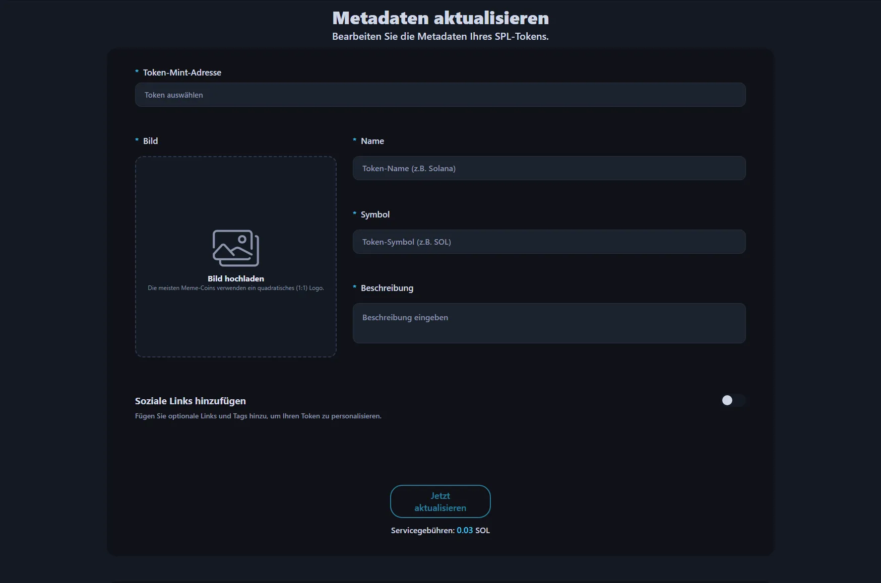 Fertig. Die Servicegebühr beträgt 0.03 SOL. Änderungen werden sofort on-chain reflektiert. Wallets und Explorer aktualisieren sich innerhalb von Minuten bis Stunden je nach Cache.