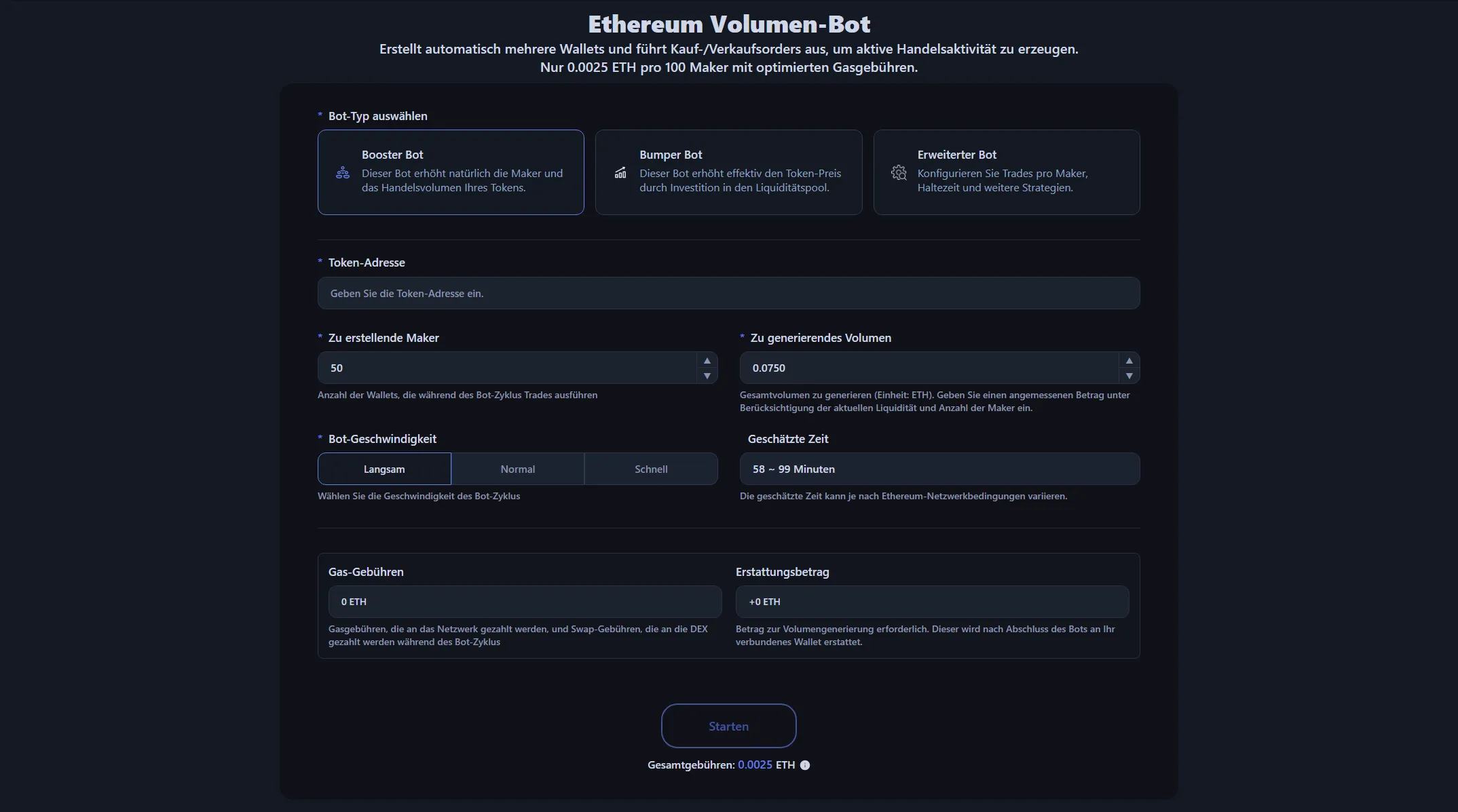 - Einstellungen anpassen: Legen Sie Maker-Anzahl, Handelsvolumen oder ETH für den Liquiditätspool und Bot-Geschwindigkeit fest.
