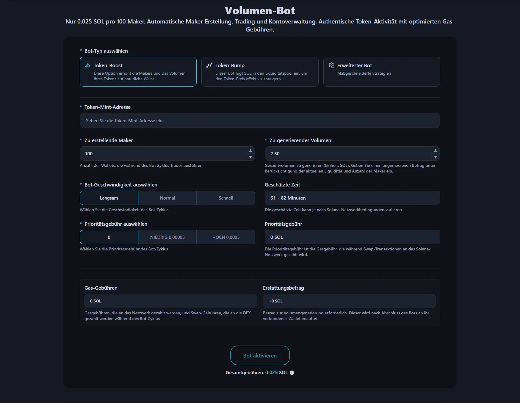 Alle zusätzlichen Kosten einschließlich Gasgebühren, DEX-Swap-Gebühren und für die Volumengenerierung benötigte SOL werden vor der Zahlung automatisch berechnet und angezeigt. Was Sie sehen, ist was Sie zahlen. Alles außer der Servicegebühr wird nach Zyklusende zurückgegeben.