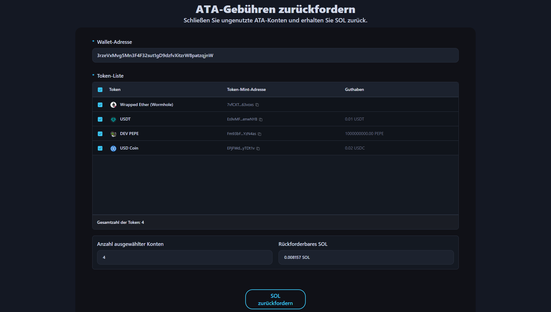- Auch Wallets mit 0 SOL-Guthaben können Miete zurückfordern, indem ein separates Gas-Gebühren-Wallet angegeben wird