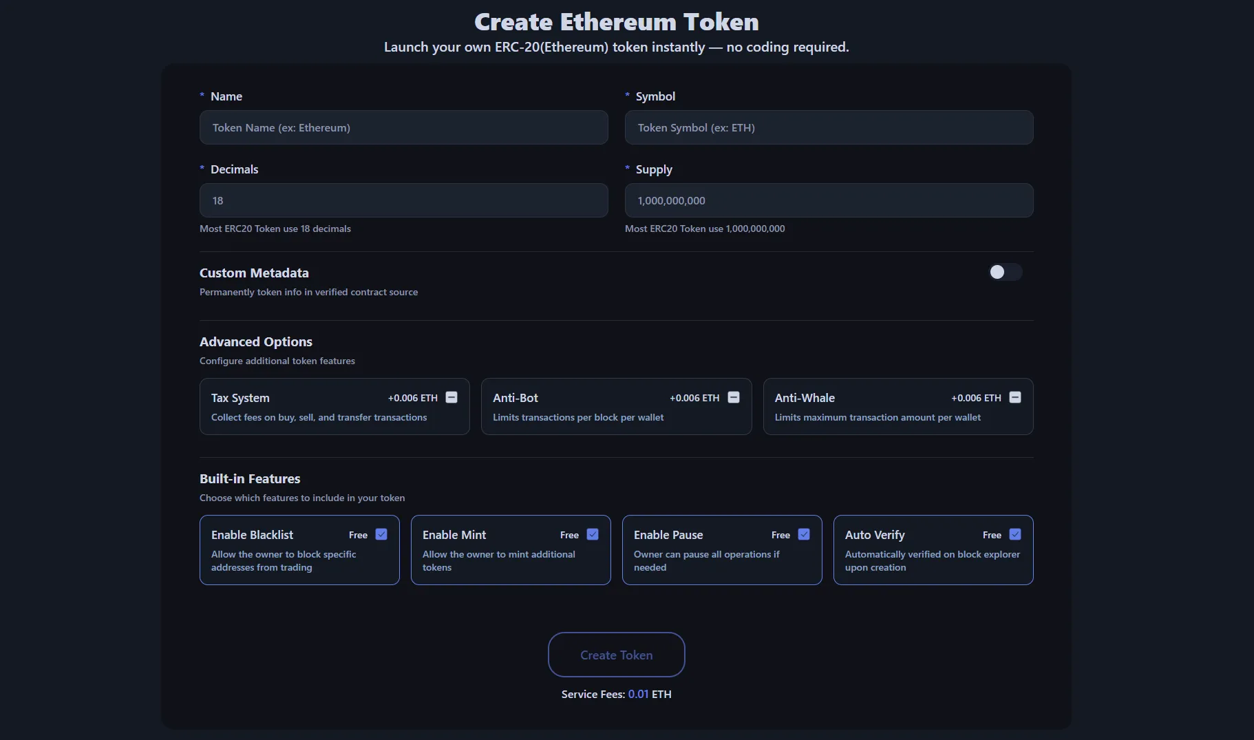 Using the Ethereum Token Creator eliminates the complex coding process. Smart contracts are automatically generated with just a few clicks, and professional-grade token deployment is completed for 0.01 ETH.