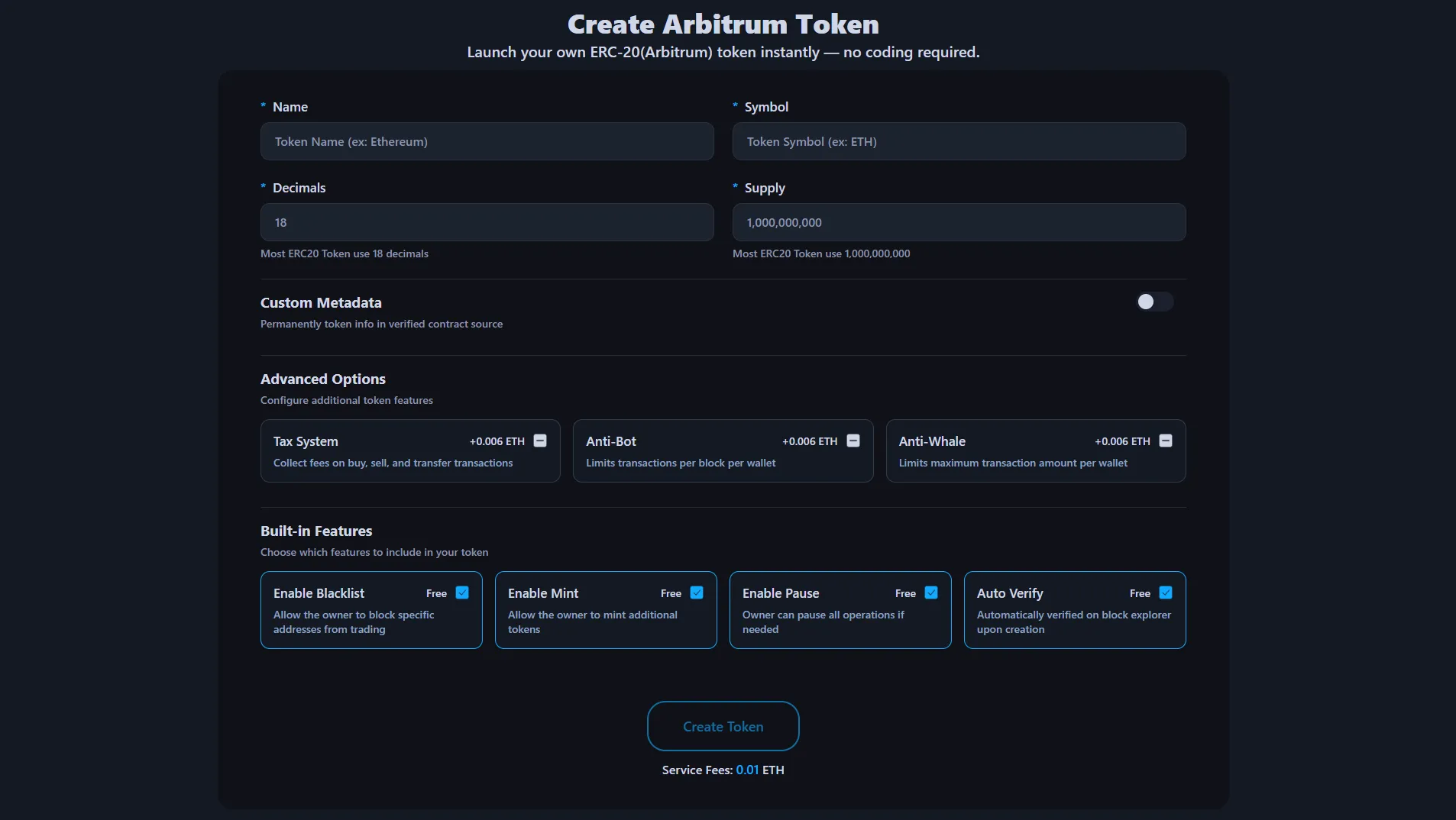 Using the Arbitrum Token Creator dApp eliminates the complex coding process. Smart contracts are automatically generated with just a few clicks, and professional-grade token deployment is completed for 0.01 ETH.