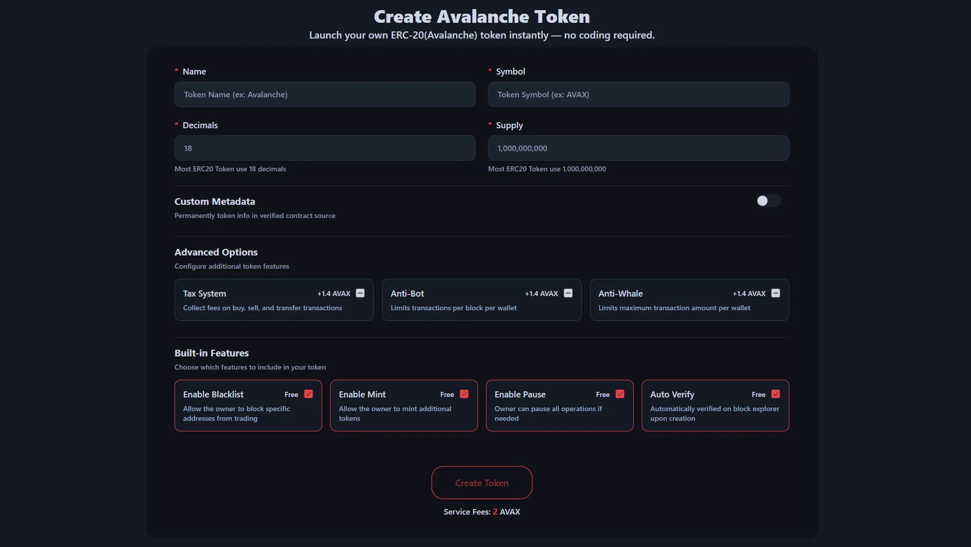 Create a Token on AVAX — No Code Avalanche Token Creator (2026)