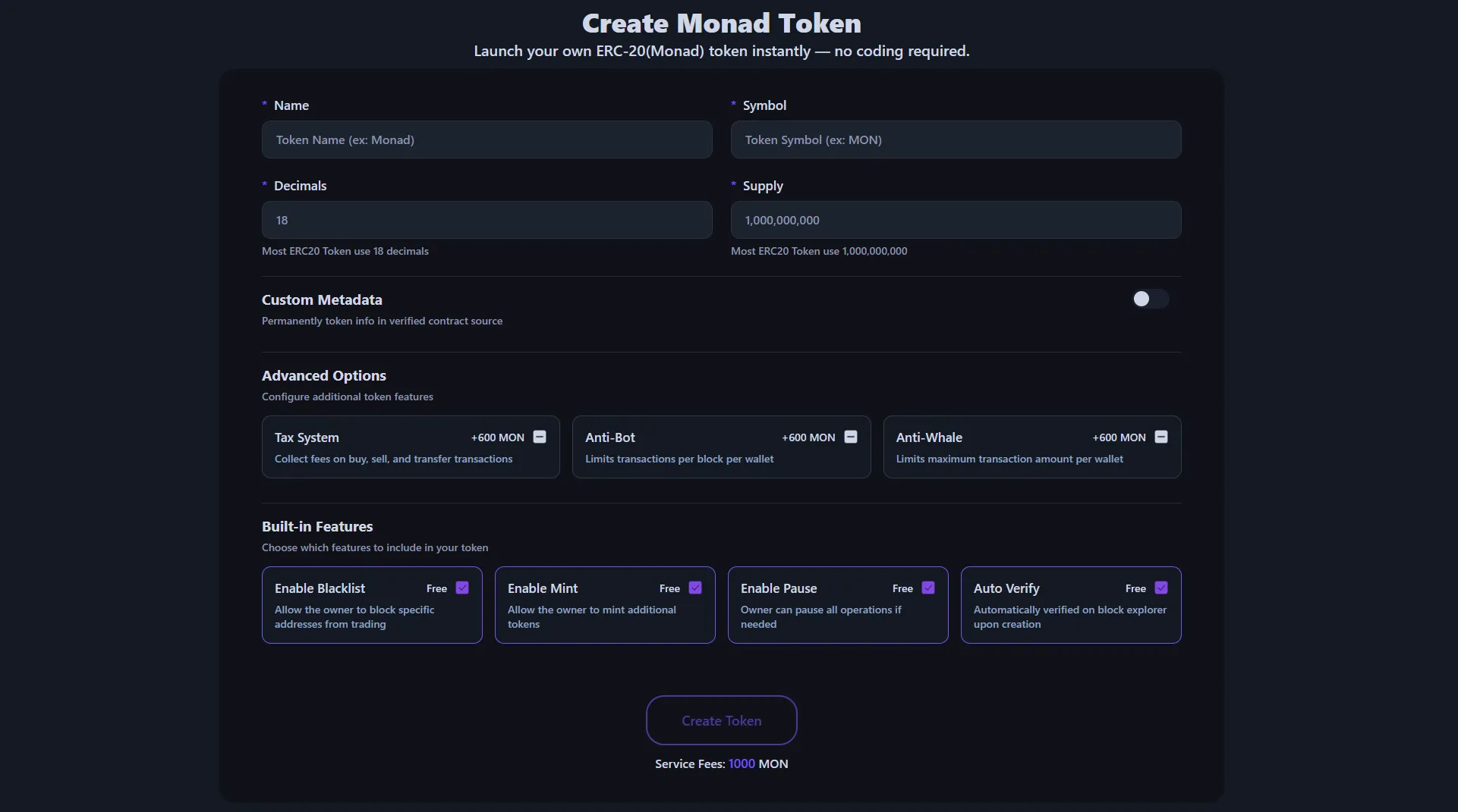 Let's walk through the step-by-step process to create a feature-rich Monad token.
