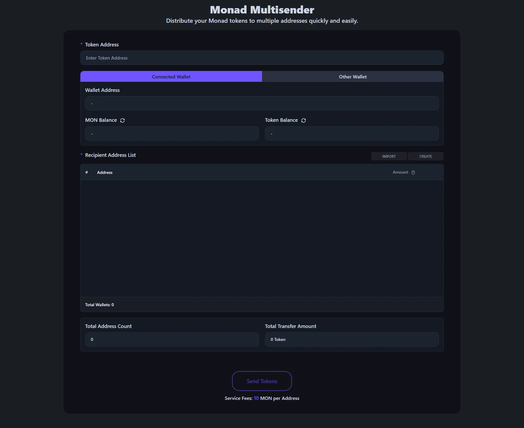 The service fee is 10 MON per recipient address. For example, if you're sending tokens to 100 wallets, the service fee would be 1,000 MON, plus the standard Monad gas fee for the transaction.