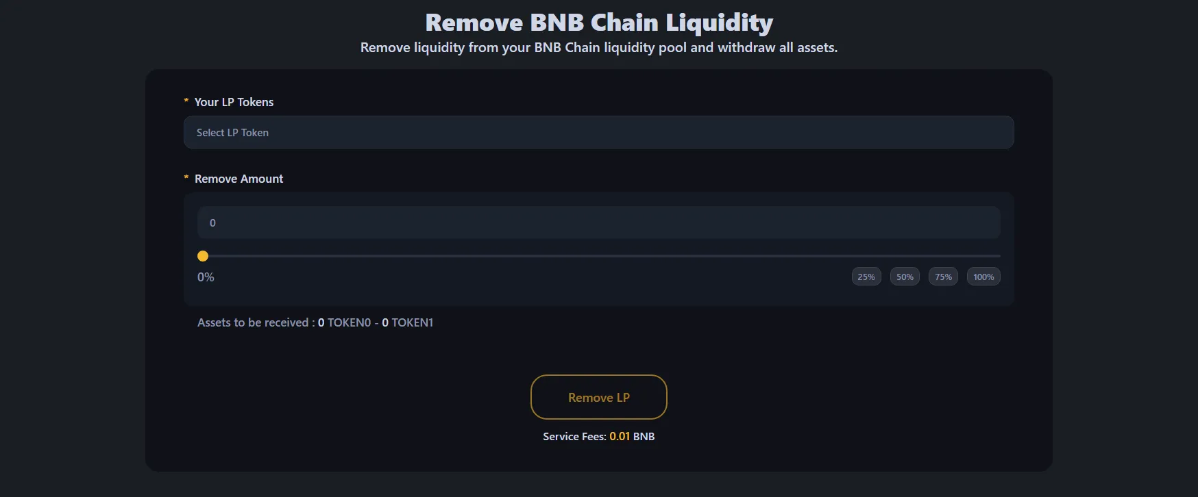 With Alphecca, the service fee is 0.01 BNB, and the gas fee is minimal. Gas costs on BNB Chain are very low, typically just a few cents for a liquidity removal transaction.