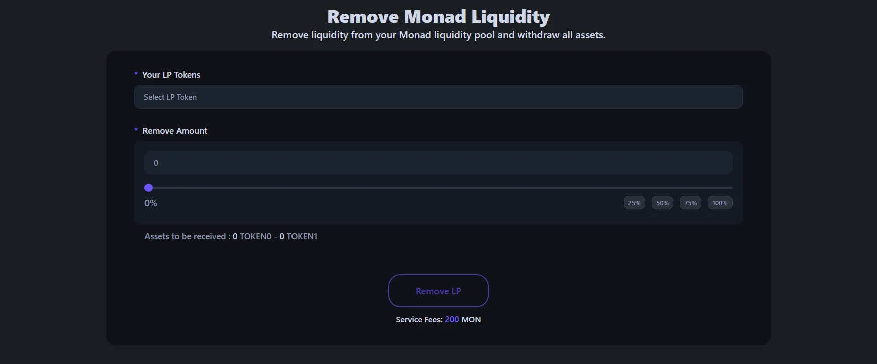 To remove liquidity from your Monad token pool, head over to the Monad Liquidity Removal Tool and connect the wallet that holds your LP tokens or NFT position.