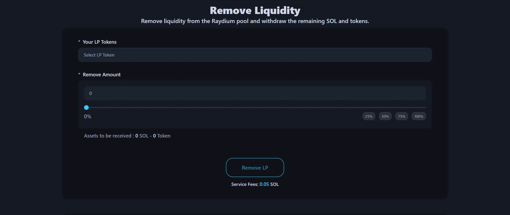 The Solana Liquidity Remover on Alphecca skips all of that. Connect your wallet, and it automatically detects your LP token positions. Select the one you want to withdraw from, choose how much to remove, and confirm. Both sides of the pair — your tokens and your SOL — are returned directly to your wallet.