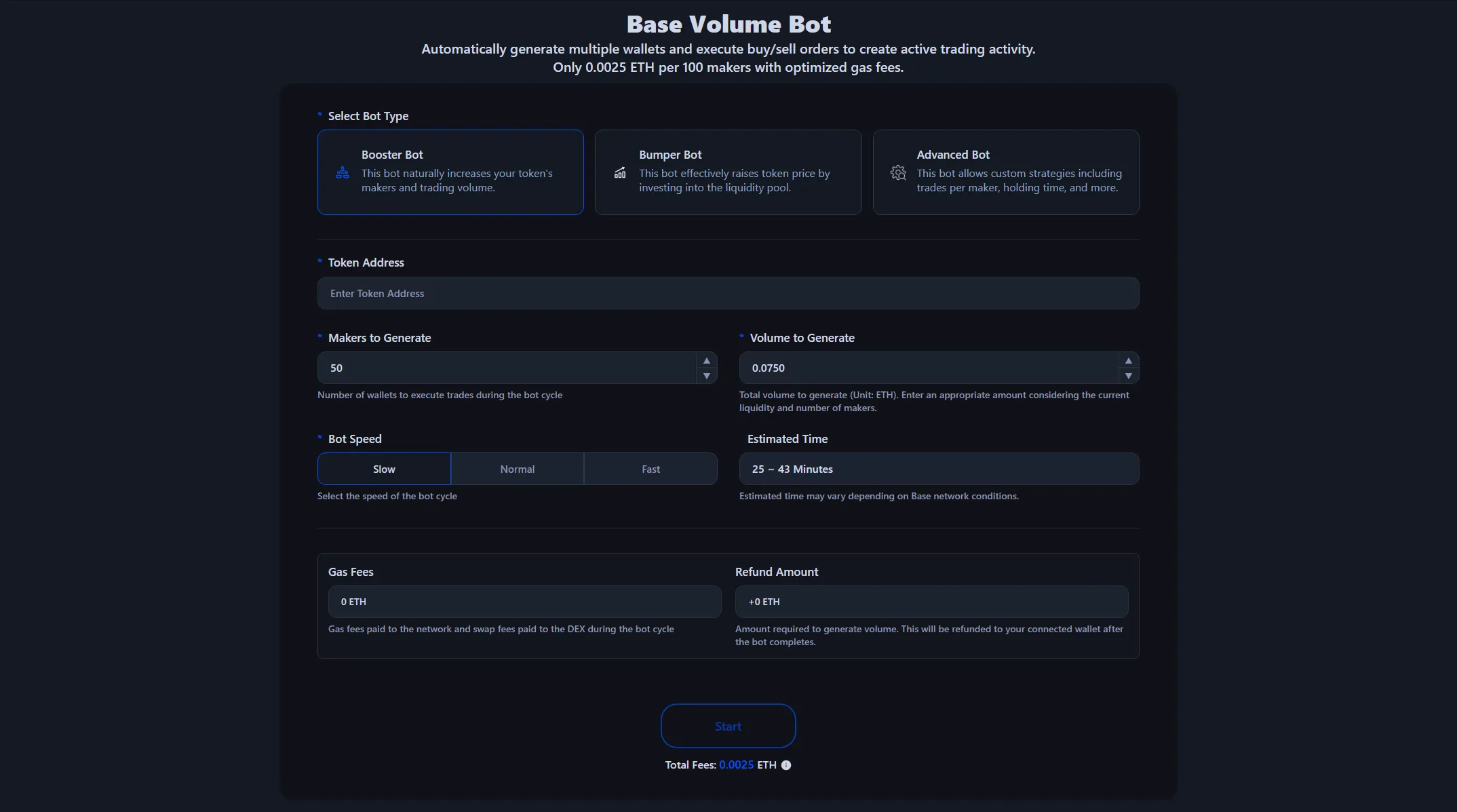 Available at 0.0025 ETH per 100 makers, with no additional cost based on trading volume. Gas fees and DEX swap fees are calculated and displayed before starting the bot, executed at optimized amounts. You can also see the ETH to be refunded after the bot completes.