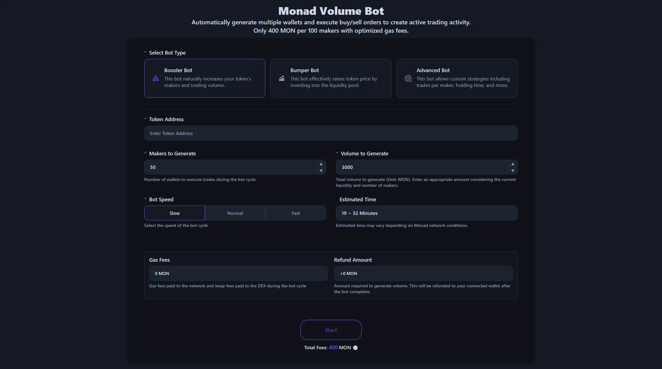 Available at 400 MON per 100 makers, with no additional cost based on trading volume. Gas fees and DEX swap fees are calculated and displayed before starting the bot, executed at optimized amounts. You can also see the MON to be refunded after the bot completes.