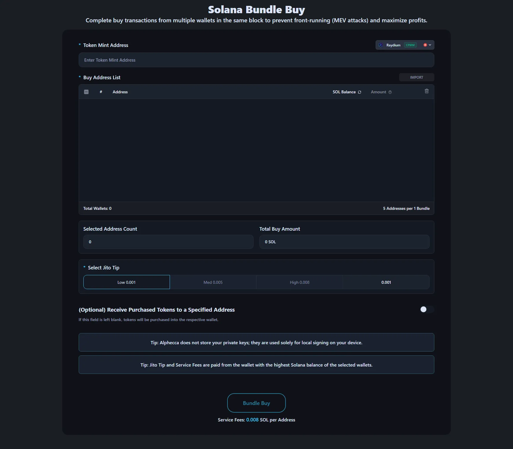 Bundle Buy supports major Solana DEXs including Raydium, Pump.Fun, PumpSwap, and others.