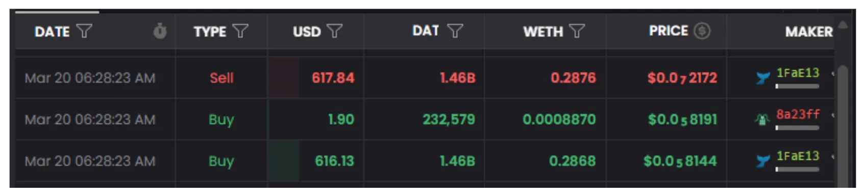 - 1FaE13 (MEV Bot) buys $616.13 worth of DAT token — the front-run.