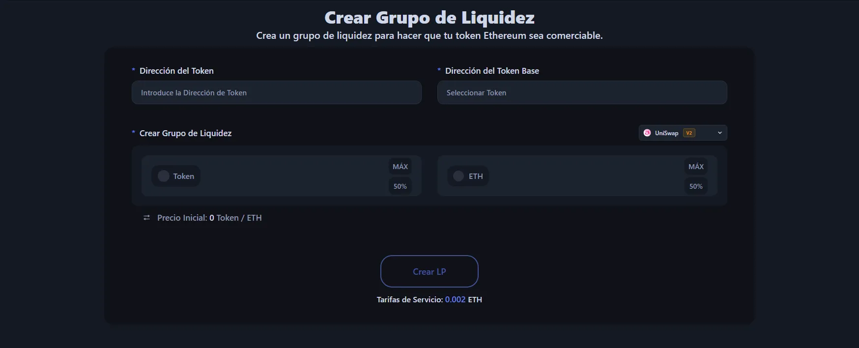 Para crear un pool de liquidez para tu token de Ethereum, dirígete a la herramienta de creación de pools de liquidez de Ethereum, asegúrate de que Ethereum esté seleccionado y conecta tu wallet.