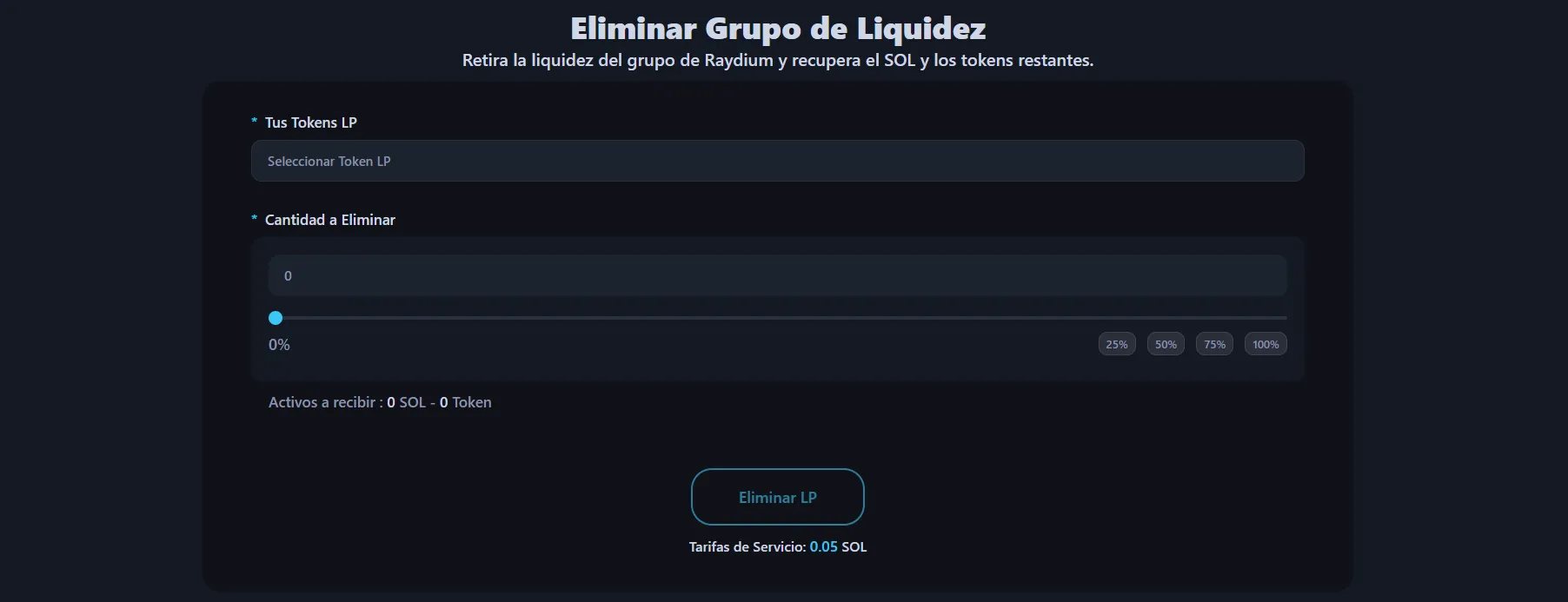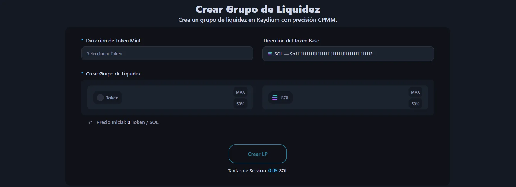 - Configura la liquidez: Introduce la cantidad de tokens y Solana a poner en el pool