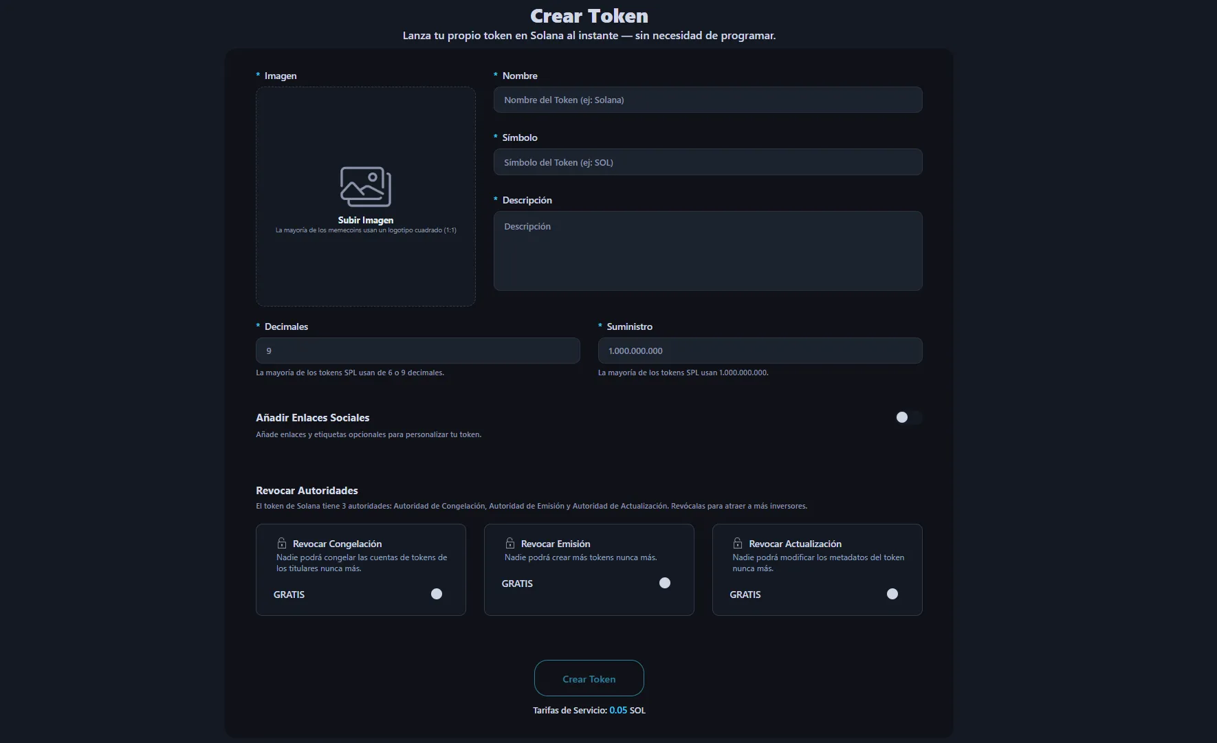 En otras plataformas, crear un token de Solana con las 3 opciones de Revoke cuesta alrededor de 0.5 SOL.
