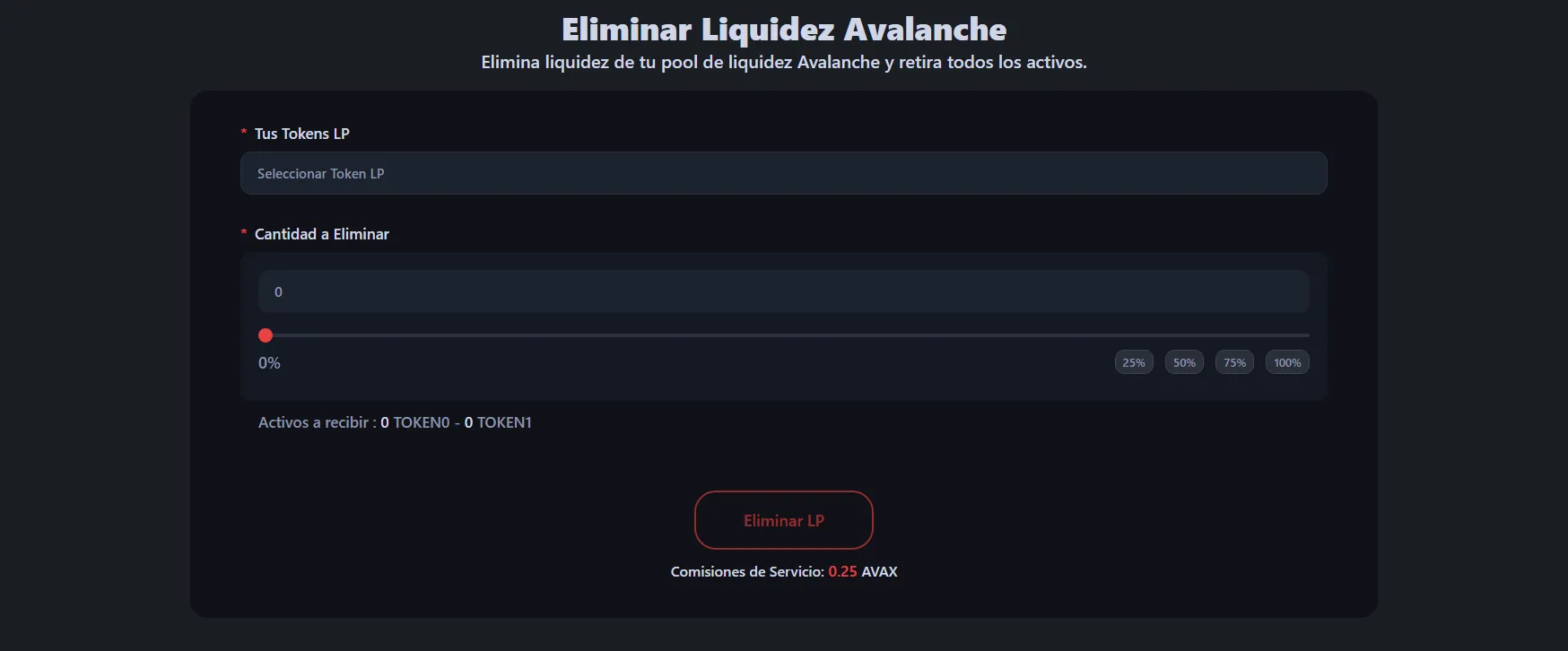 Para retirar liquidez de tu pool de tokens Avalanche, dirígete a la herramienta de retiro de liquidez de Avalanche y conecta la wallet que contiene tus tokens LP o posición NFT.