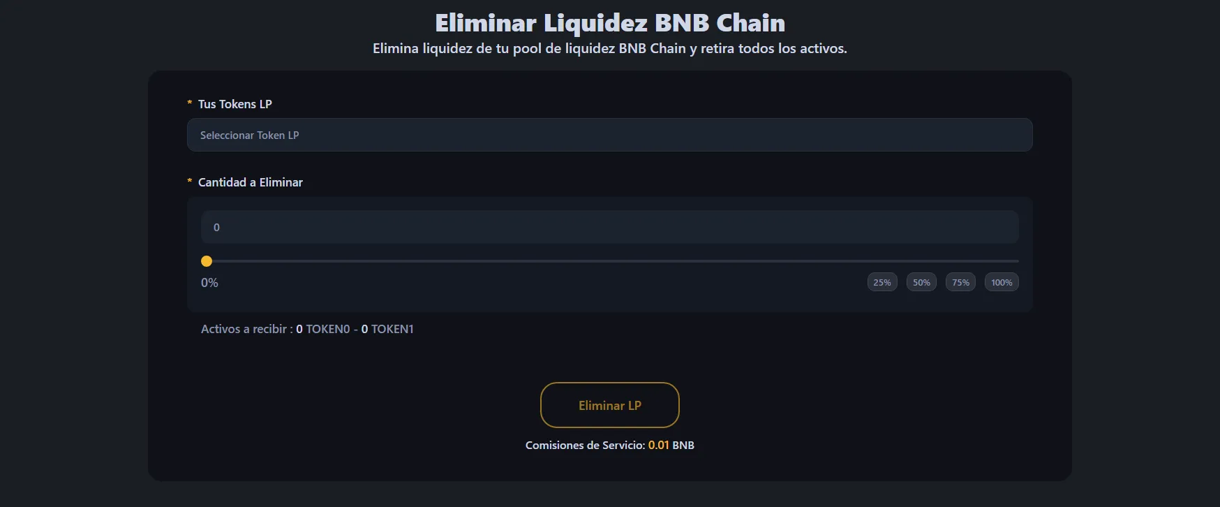Para retirar liquidez de tu pool de tokens BNB Chain, dirígete a la herramienta de retiro de liquidez de BNB Chain y conecta la wallet que contiene tus tokens LP o posición NFT.