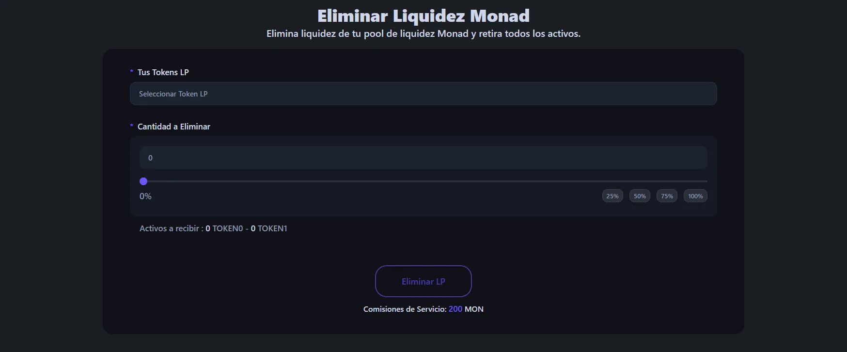 Para retirar liquidez de tu pool de tokens Monad, dirígete a la herramienta de retiro de liquidez de Monad y conecta la wallet que contiene tus tokens LP o posición NFT.