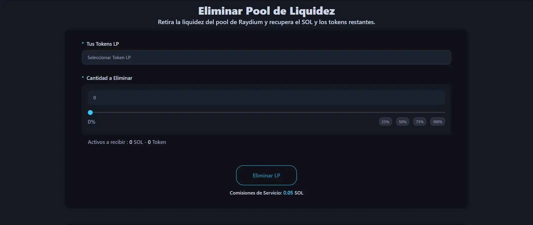 El Solana Liquidity Remover en Alphecca se salta todo eso. Conecta tu billetera y detecta automáticamente tus posiciones de tokens LP. Selecciona el pool, elige cuánto retirar y confirma. Ambos lados del par — tokens y SOL — vuelven directamente a tu billetera.