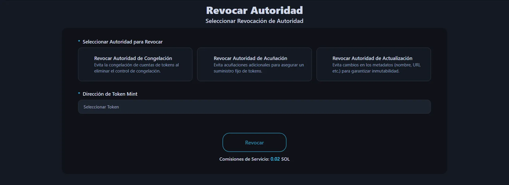 Seleccionar tipo de autoridad: Elige qué autoridad deseas revocar: Autoridad de congelamiento, Autoridad de acuñación o Autoridad de actualización.