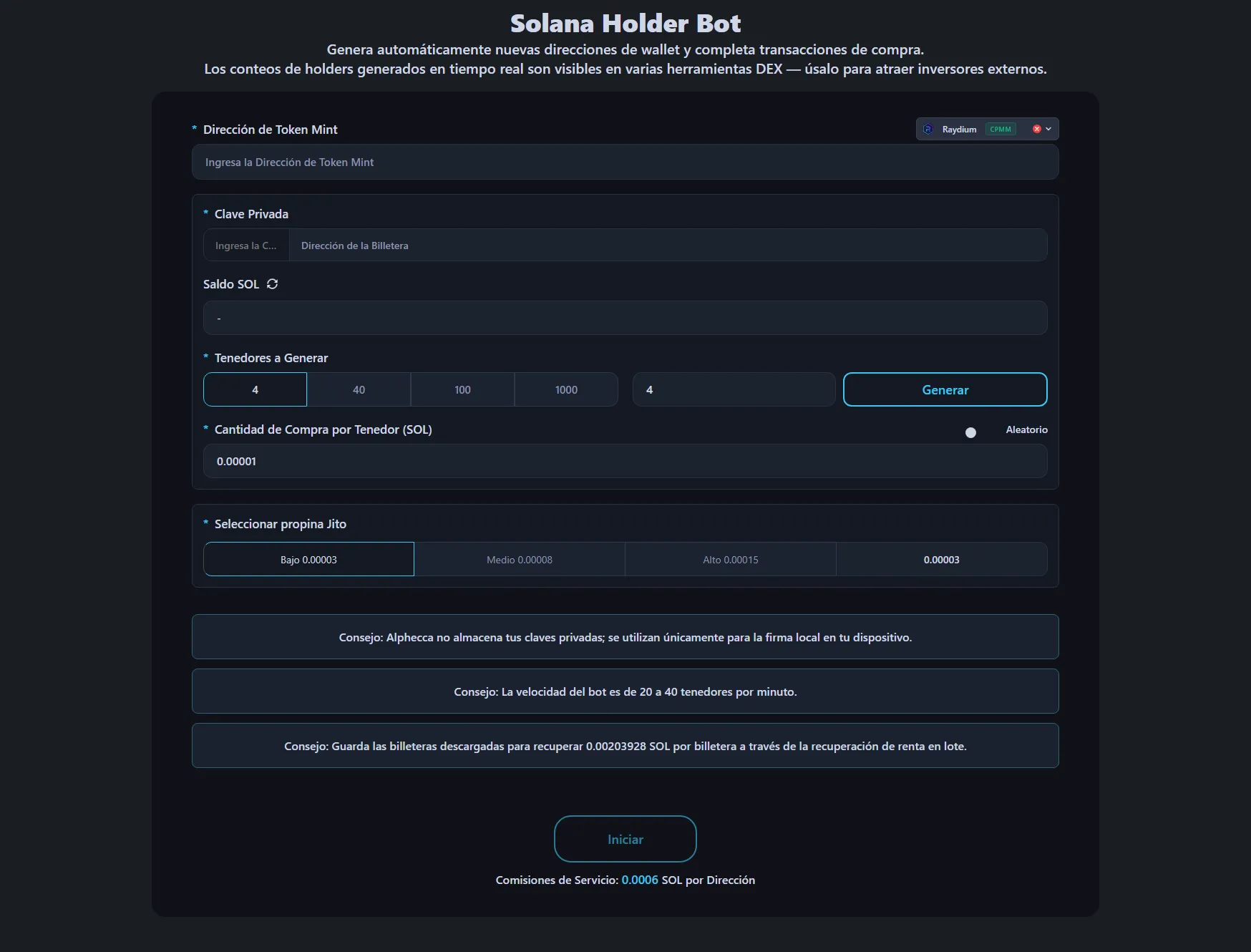 El Bot de Holders en Solana de Alphecca Tools automatiza la generación de holders. Crea nuevas wallets, compra tu token desde cada una, y los tokens permanecen en esas wallets — aumentando directamente tu número de holders on-chain.