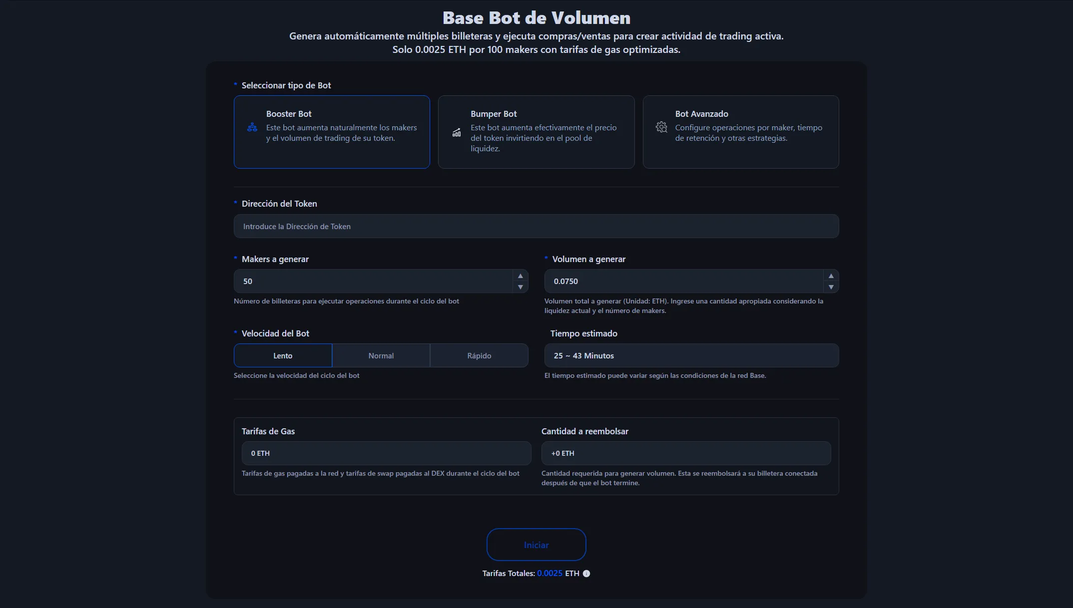 - Configura los Ajustes: Establece el número de makers a generar, el volumen de trading o cantidad de ETH a inyectar en el pool de liquidez, y la velocidad del bot.