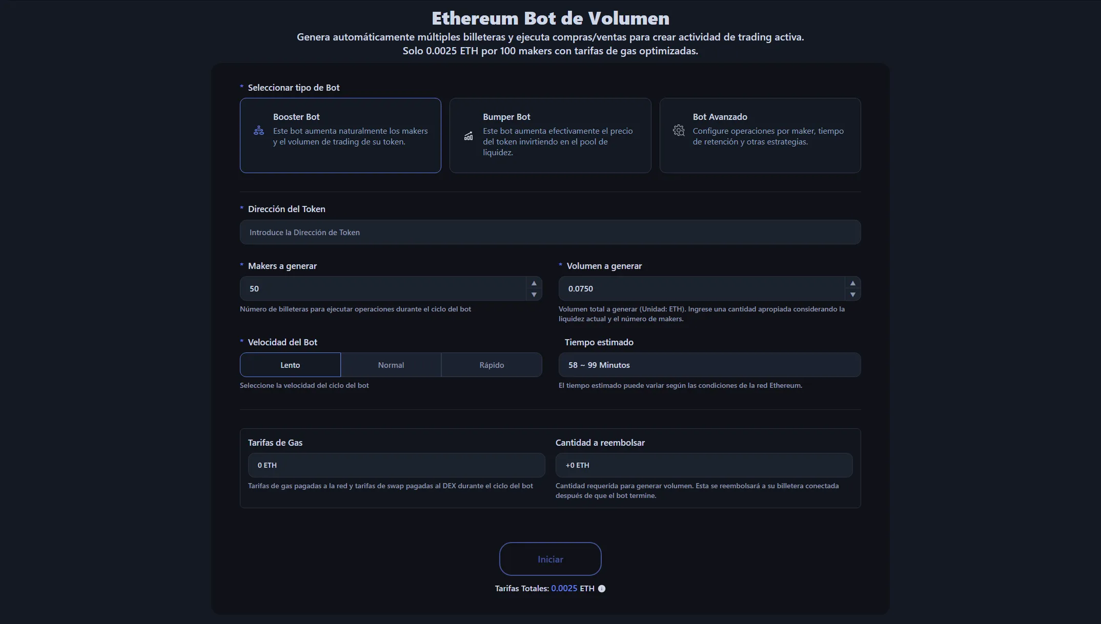 0.0025 ETH por cada 100 makers sin comisiones adicionales basadas en el volumen de trading. Las comisiones de gas y swap DEX se calculan y muestran antes de iniciar, ejecutándose a cantidades optimizadas. También puedes verificar el ETH a reembolsar después de completar.