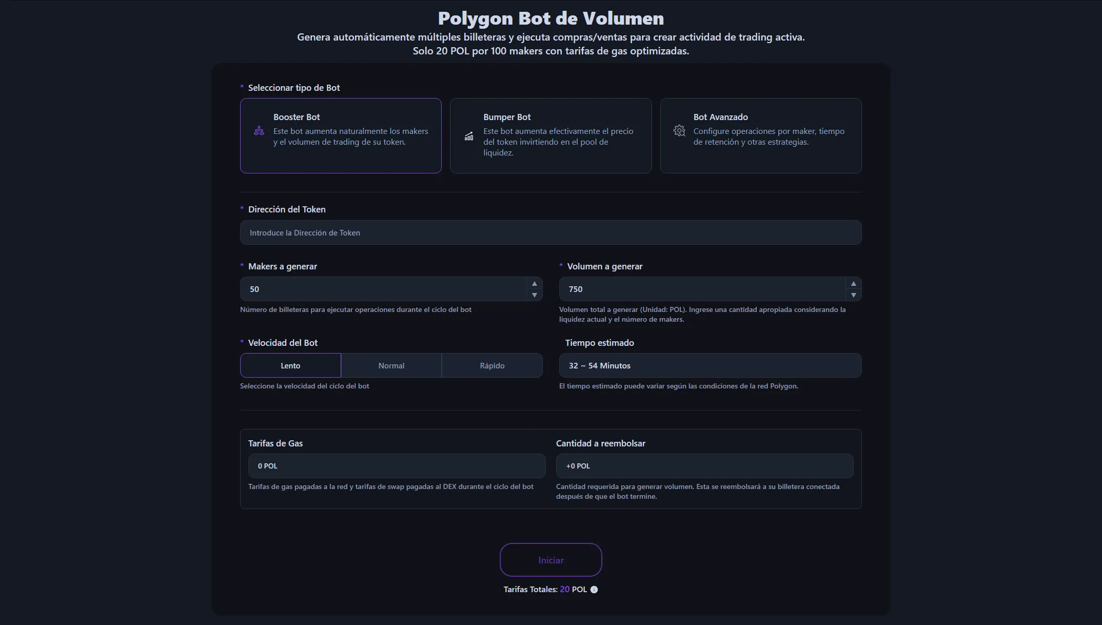Disponible por 20 POL por cada 100 makers, sin costes adicionales basados en el volumen de trading. Las comisiones de gas y las comisiones de swap DEX se calculan y muestran antes de iniciar el bot, ejecutándose a cantidades optimizadas. También puedes ver el POL que se reembolsará después de que el bot termine.