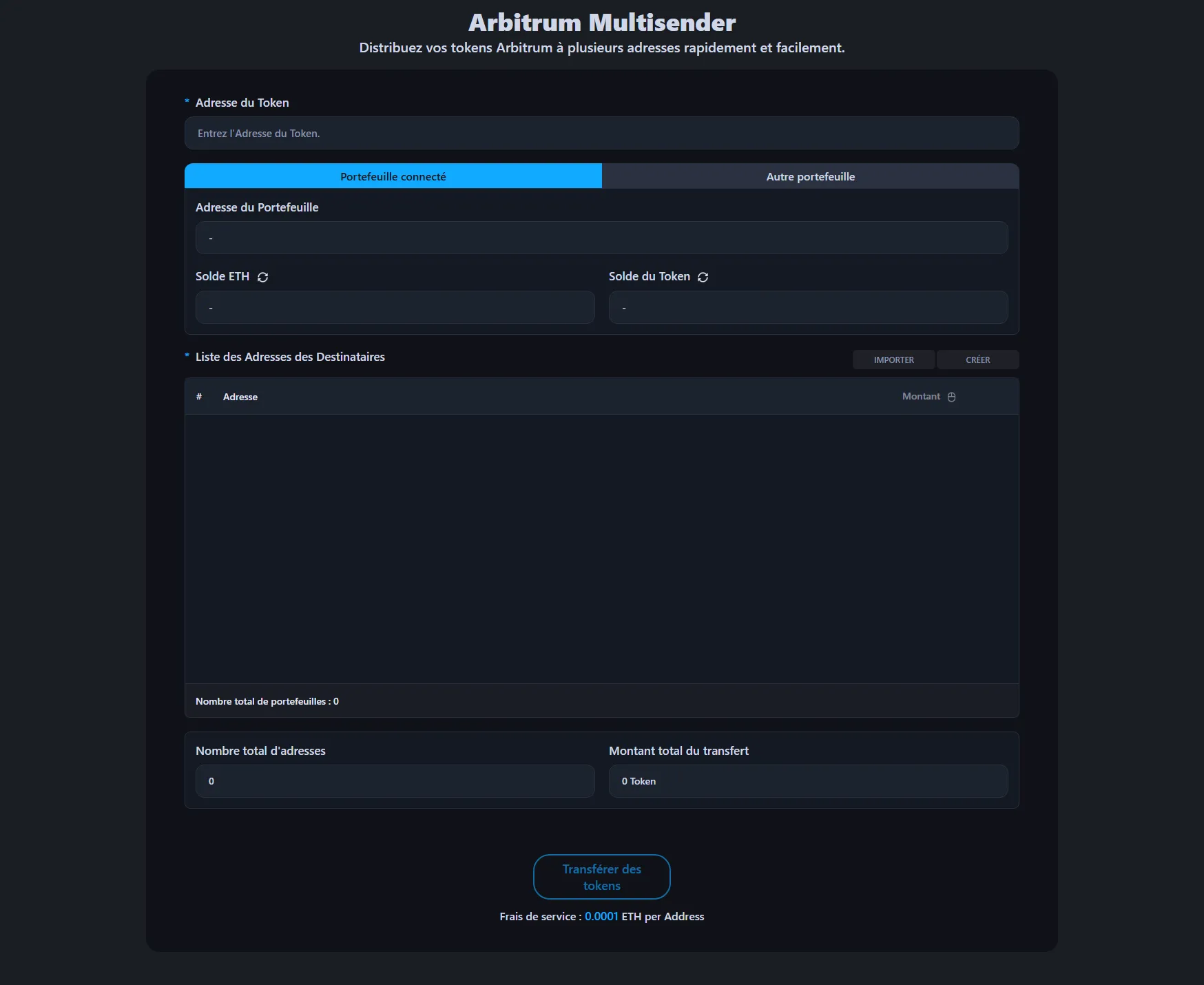Les frais de service sont de 0,0001 ETH par adresse de destinataire. Par exemple, si vous envoyez des tokens à 100 portefeuilles, les frais de service seraient de 0,01 ETH, plus les frais de gas standard d'Arbitrum.