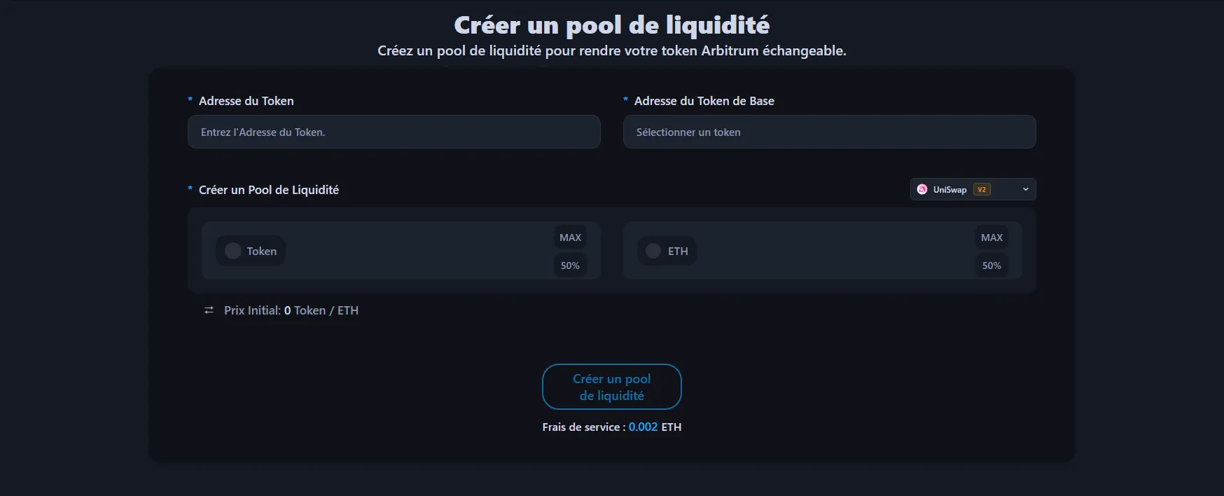 Avec Alphecca, les frais de service sont de 0,002 ETH, et les frais de gas sont minimes. Il n'y a pas de coûts supplémentaires. Cependant, vous devrez fournir vos propres tokens et tokens d'appairage (ETH, USDT, etc.) pour le pool. Arbitrum est un réseau Layer 2 d'Ethereum avec des frais de gas très bas, ce qui rend la création de pools de liquidité extrêmement économique.