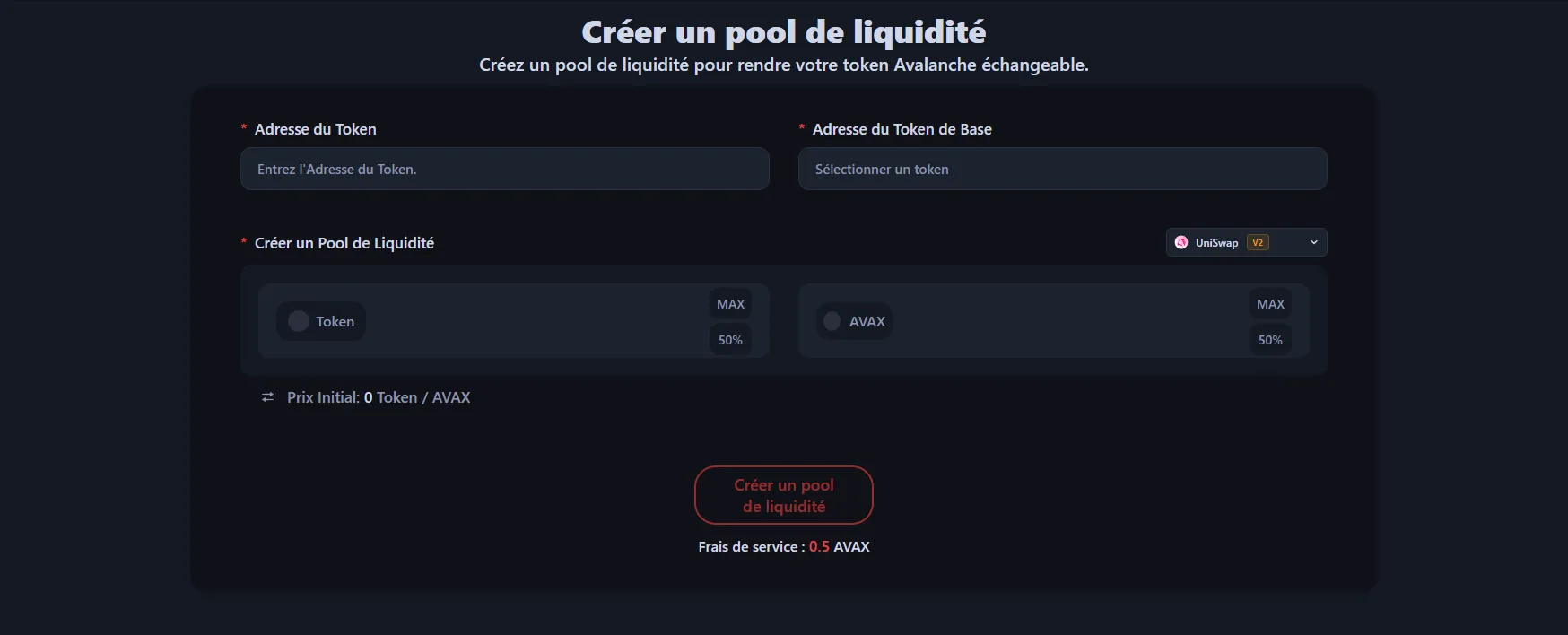 Avec Alphecca, les frais de service sont de 0,5 AVAX, et les frais de gas sont minimes. Il n'y a pas de coûts supplémentaires. Cependant, vous devrez fournir vos propres tokens et tokens d'appairage (AVAX, USDT, etc.) pour le pool. Avalanche a des frais de gas bas, ce qui rend la création de pools de liquidité économique.