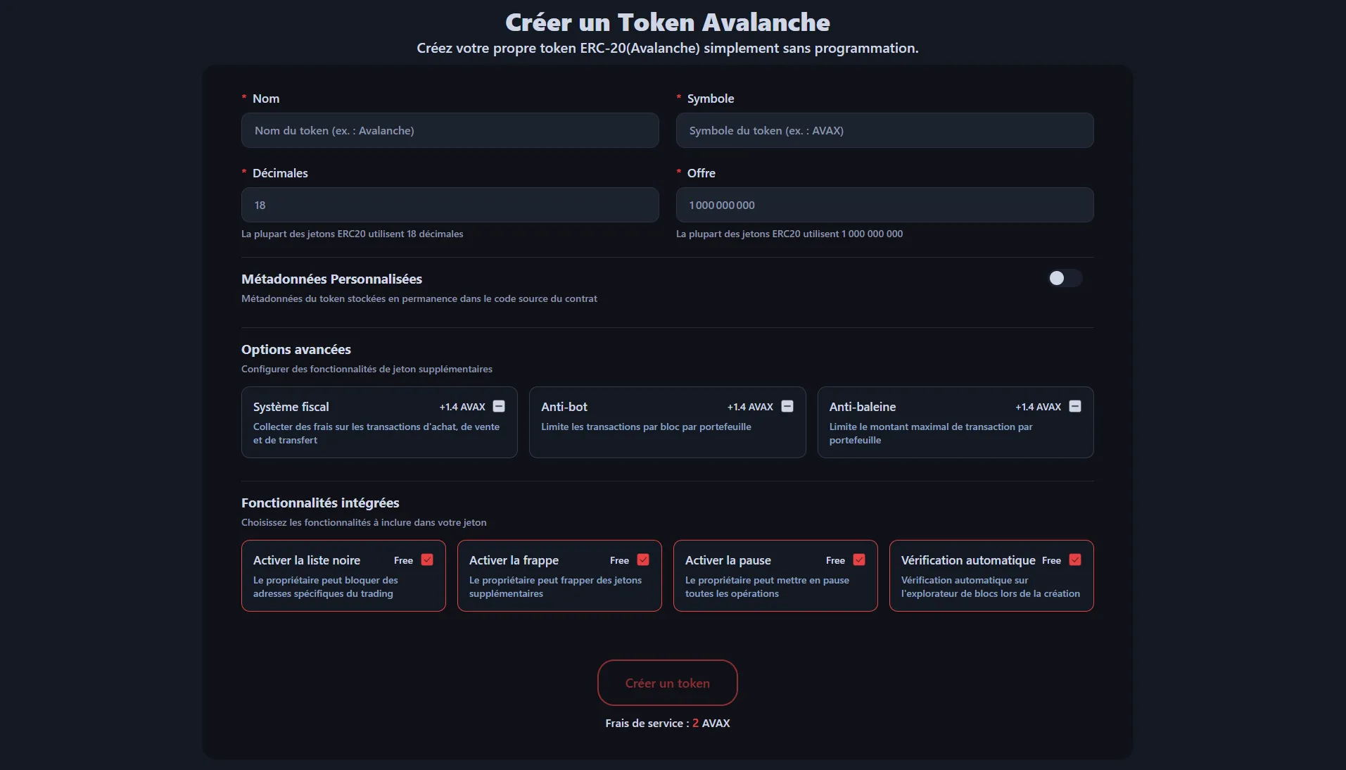 Cette dApp est entièrement conforme au standard Avalanche (ERC-20), conçu pour résoudre les problèmes de scalabilité d'Ethereum, reconnu pour ses frais bas et ses vitesses de traitement rapides. Au-delà de la simple création de tokens, vous pouvez configurer librement des options détaillées pour correspondre aux caractéristiques de votre projet.