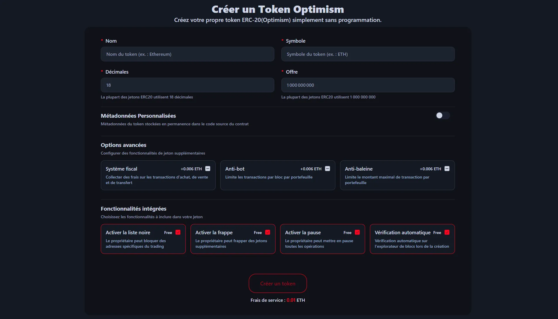 Cette dApp est entièrement conforme au standard Optimism (ERC-20), conçu pour résoudre les problèmes de scalabilité d'Ethereum, reconnu pour ses frais bas et ses vitesses de traitement rapides. Au-delà de la simple création de tokens, vous pouvez configurer librement des options détaillées pour correspondre aux caractéristiques de votre projet.