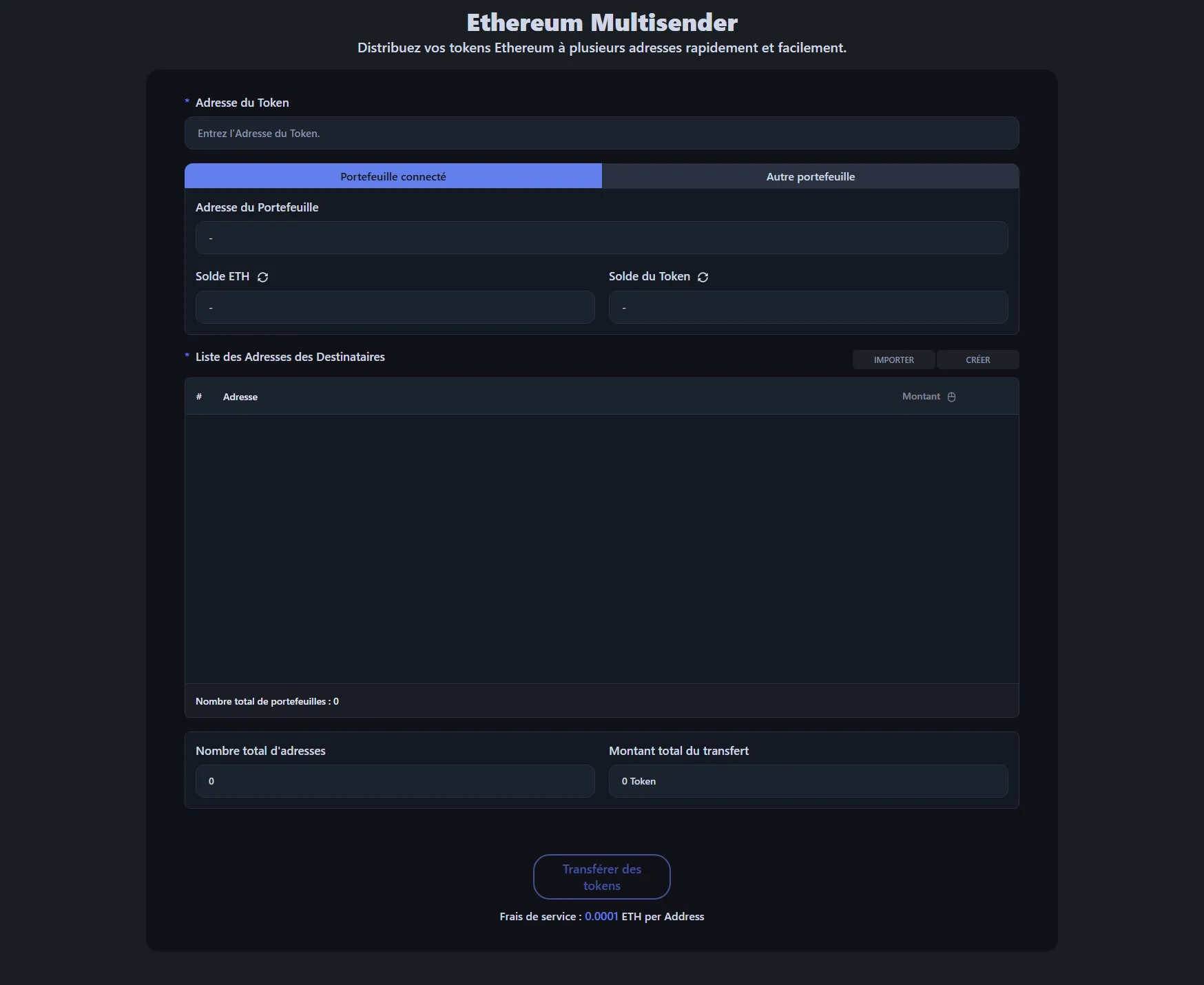 Les frais de service sont de 0,0001 ETH par adresse de destinataire. Par exemple, si vous envoyez des tokens à 100 portefeuilles, les frais de service seraient de 0,01 ETH, plus les frais de gas standard d'Ethereum.