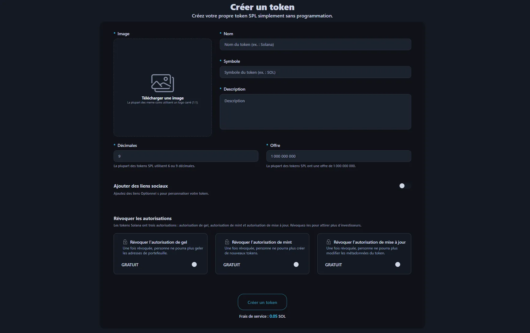Sur d'autres plateformes, créer un token Solana avec les 3 options Revoke coûte environ 0.5 SOL.