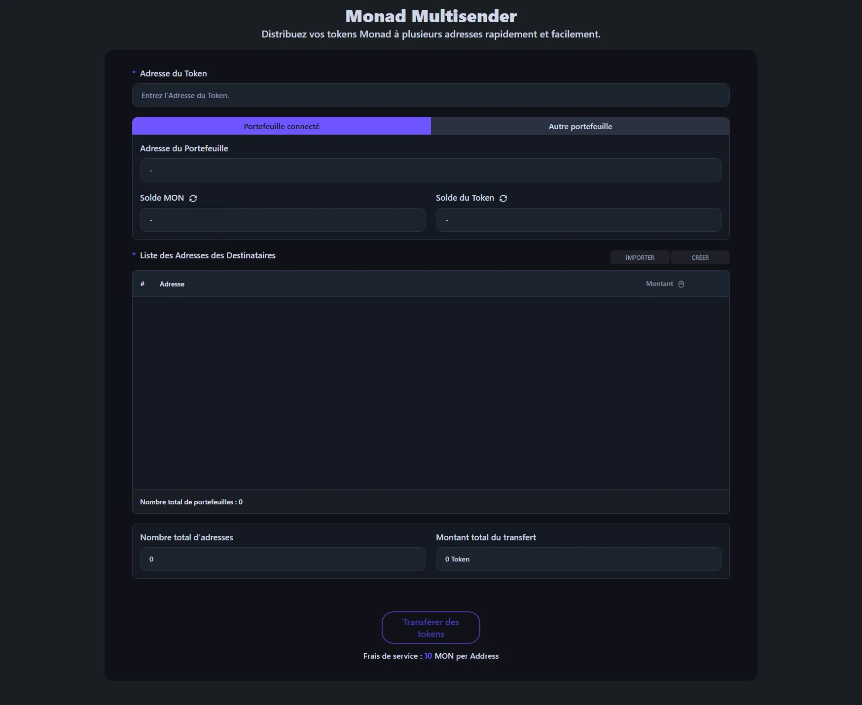 Les frais de service sont de 0,0001 ETH par adresse de destinataire. Par exemple, si vous envoyez des tokens à 100 portefeuilles, les frais de service seraient de 0,01 ETH, plus les frais de gas standard d'Monad.