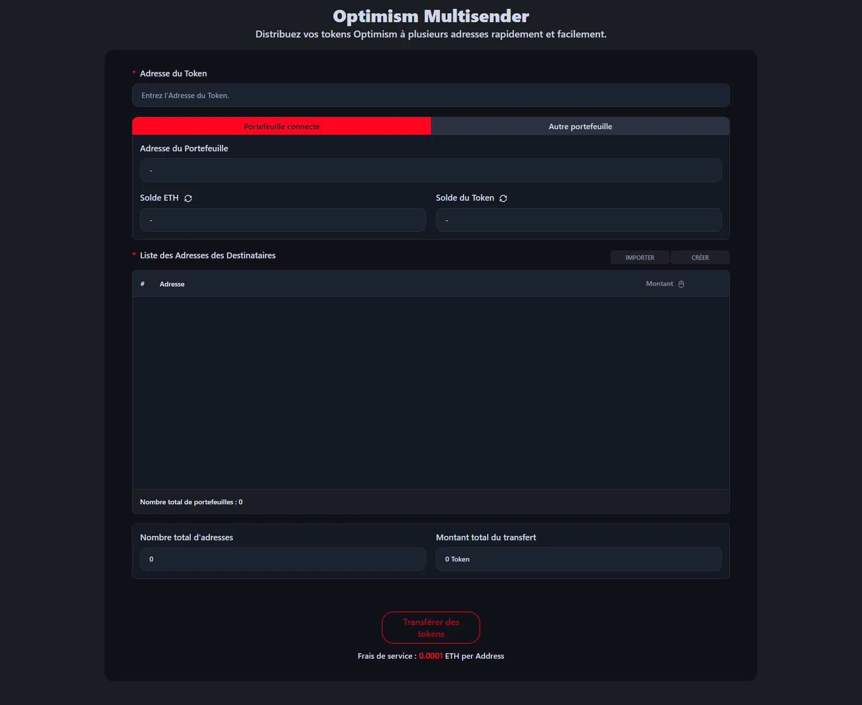 Les frais de service sont de 0,0001 ETH par adresse de destinataire. Par exemple, si vous envoyez des tokens à 100 portefeuilles, les frais de service seraient de 0,01 ETH, plus les frais de gas standard d'Optimism.