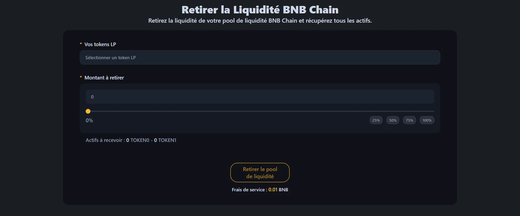 Retirer la liquidité de votre pool de tokens BNB Chain est un processus rapide et simple avec Alphecca. Que ce soit pour récupérer vos actifs, ajuster votre stratégie ou migrer vers une autre chaîne, aucune connaissance en programmation n'est nécessaire. Connectez votre portefeuille, choisissez votre pool et retirez.