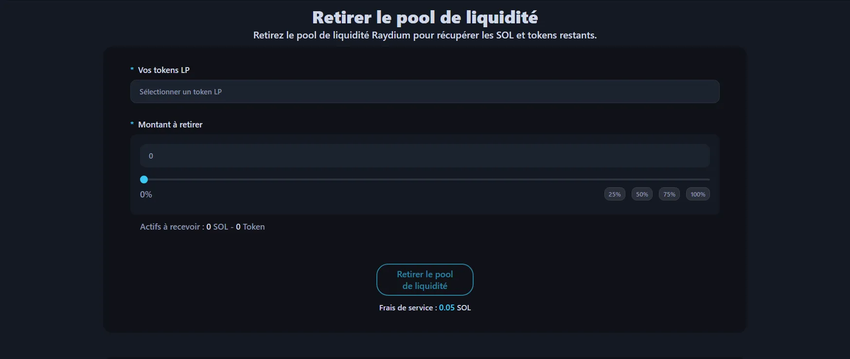 Si vos tokens LP ont été brûlés, la liquidité est verrouillée en permanence. L'outil ne fonctionne qu'avec les tokens LP encore dans votre portefeuille.