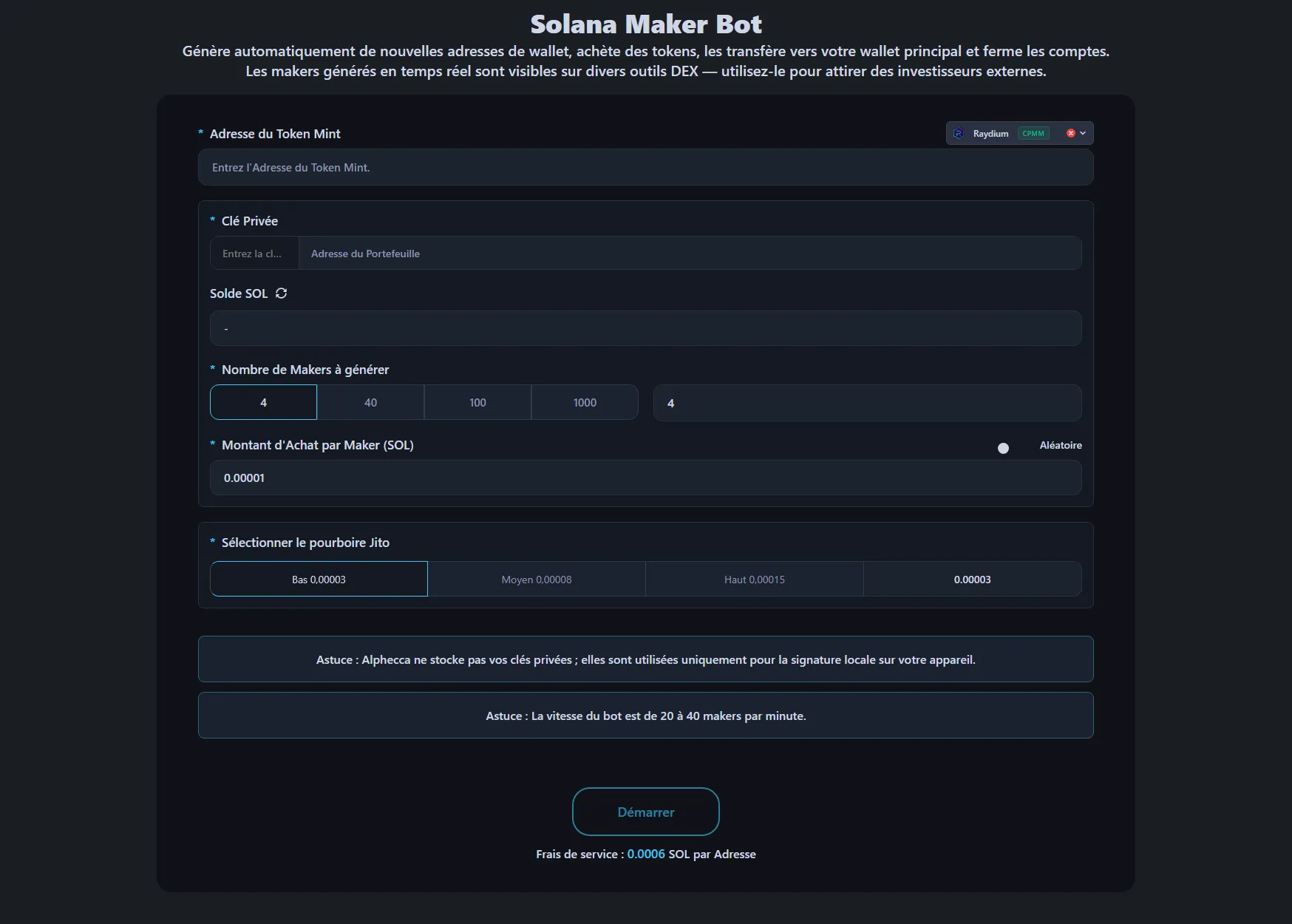 Le Solana Maker Bot sur Alphecca Tools crée de nouveaux portefeuilles, achète votre token depuis chacun via des Jito bundles, renvoie les tokens à votre portefeuille de paiement et nettoie entièrement le portefeuille maker ensuite.