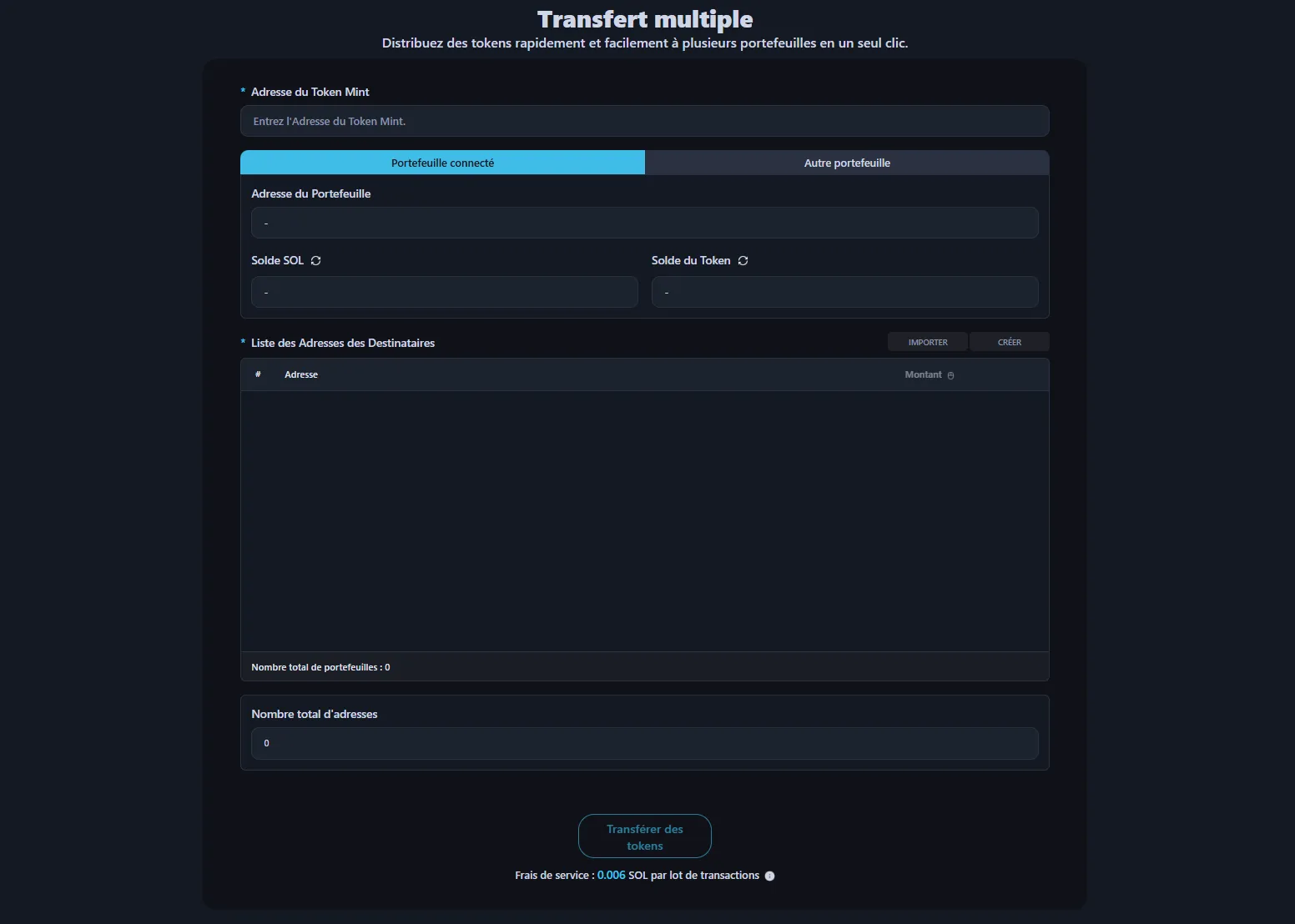 Il n'y a pas de frais par adresse. Que votre lot contienne 1 adresse ou le maximum, les frais de service par lot restent les mêmes : 0.006 SOL.