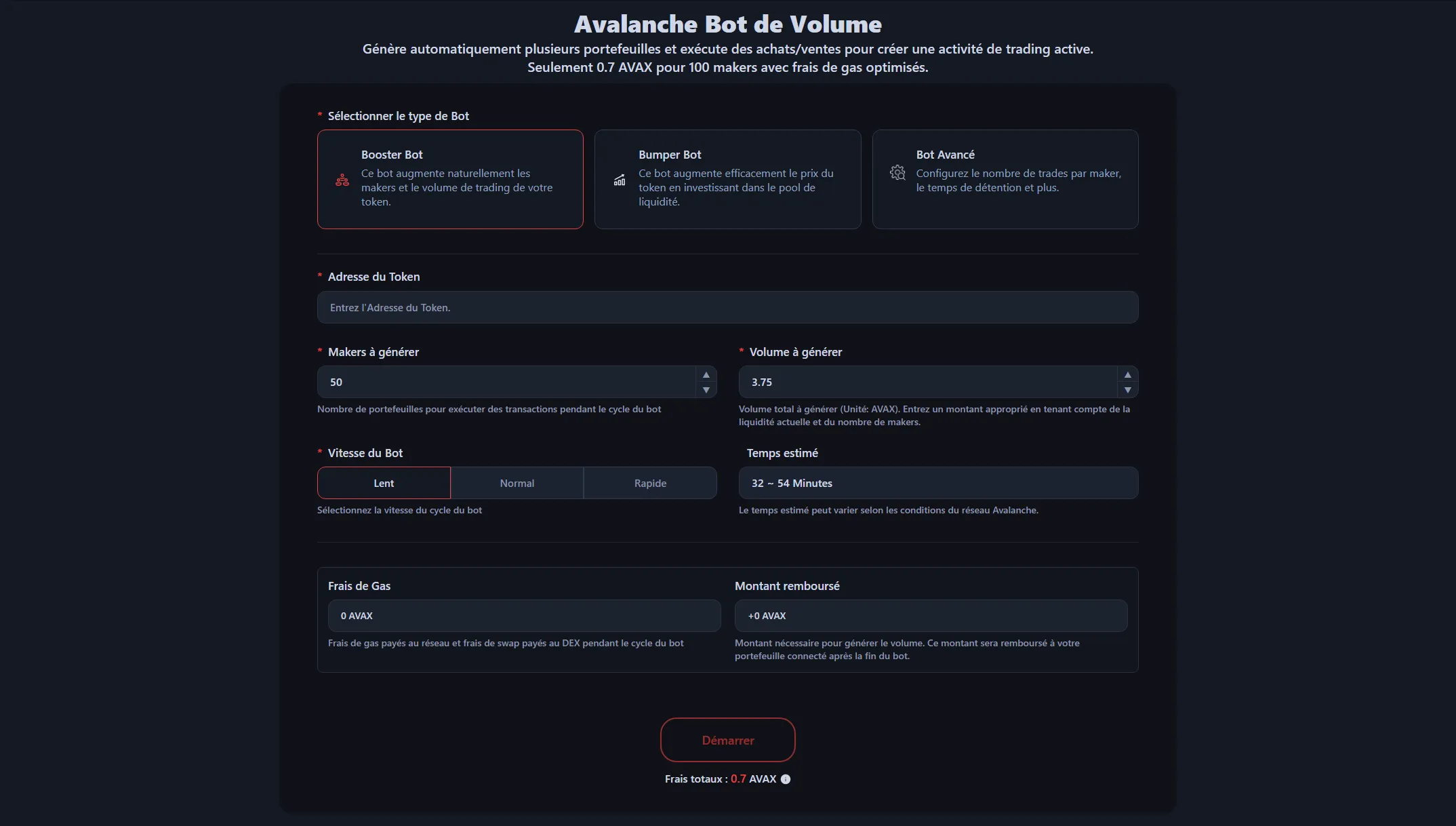 Disponible à 0.7 AVAX pour 100 makers, sans frais supplémentaires basés sur le volume de trading. Les frais de gas et les frais de swap DEX sont calculés et affichés avant le démarrage du bot, exécutés à des montants optimisés. Vous pouvez également voir les AVAX qui seront remboursés après la fin du bot.